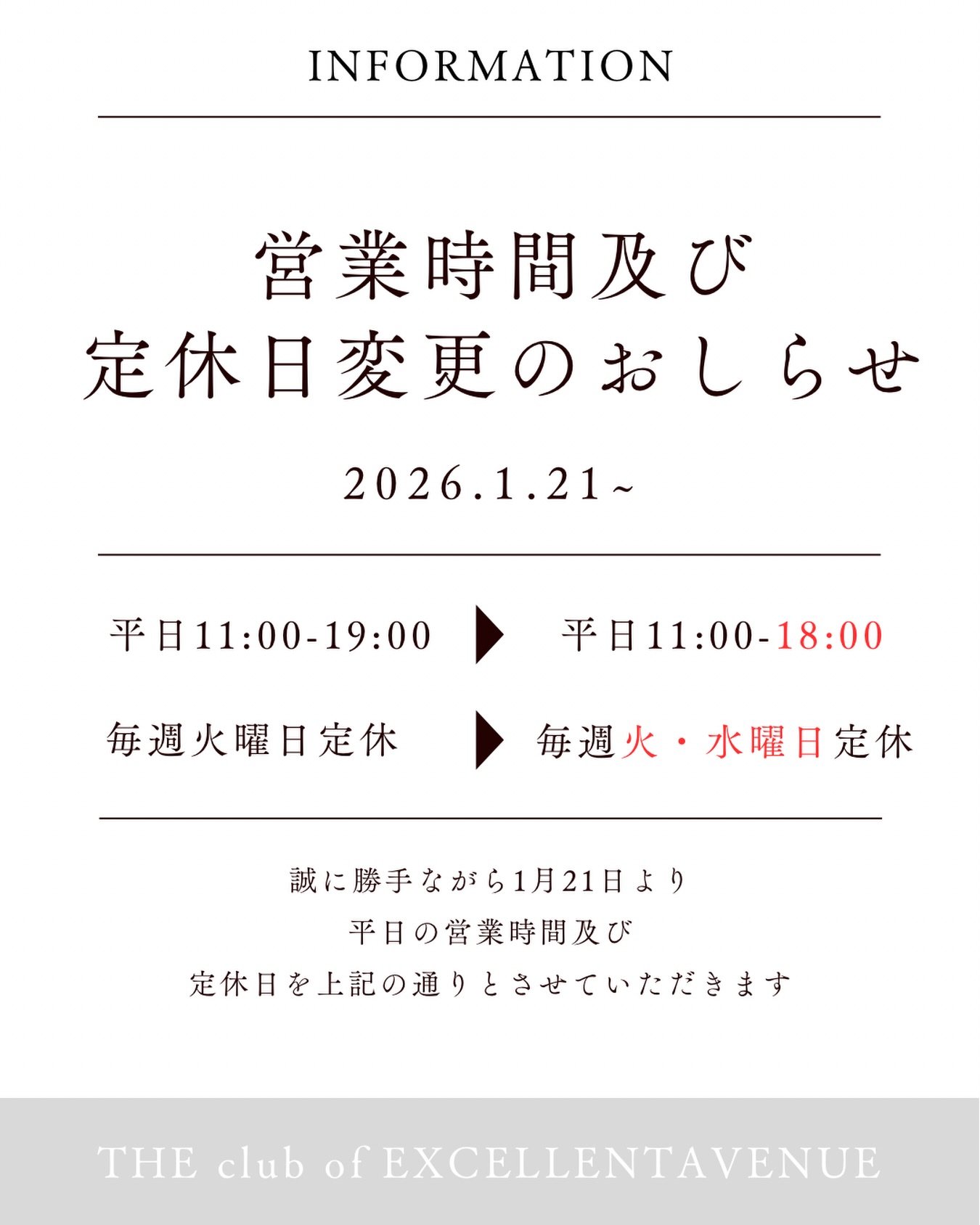 INFORMATION インフォメーション エクセレントアヴェニューの最新情報をお知らせします 2026年01月21日 営業時間及び定休日変更のお知らせ 2026年1月21日より平日の営業時間を以下の通り変更させていただきます。 また、定休日を毎週火曜水曜定休へ変更いたします。 旧営業時間 11:00-19:00 ▼ 新営業時間 11:00-18:00 2026年も引き続き沢山のカップル様、 そして大切なゲストの皆様へ幸せの輪を広げられるよう精一杯尽力して参ります。 今後ともエクセレントアヴェニューをよろしくお願い致します。 < 前へ 一覧 次へ > CATEGORY カテゴリー お知らせ フェア ARCHIVES 過去の記事 月を選択 2026年2月 (1) 2026年1月 (2) 2024年11月 (1) 2024年4月 (1) 2023年5月 (1) 2023年1月 (1)